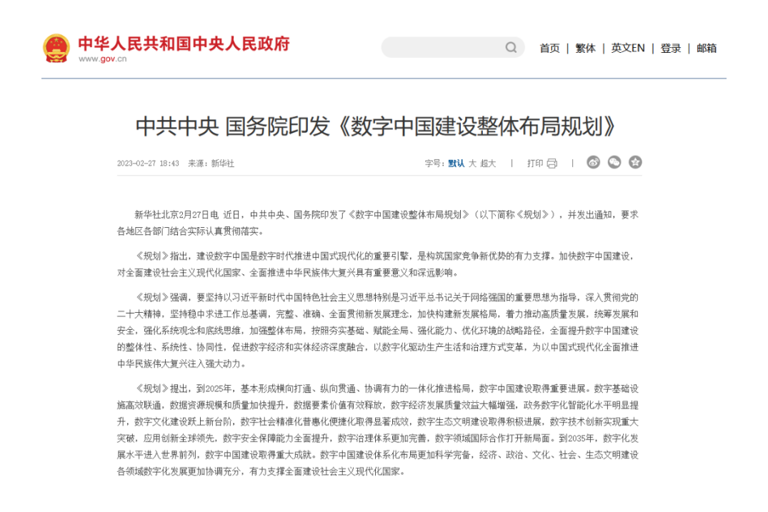 (《數(shù)字中國建設(shè)整體布局規(guī)劃》圖片來源:中國政府網(wǎng))